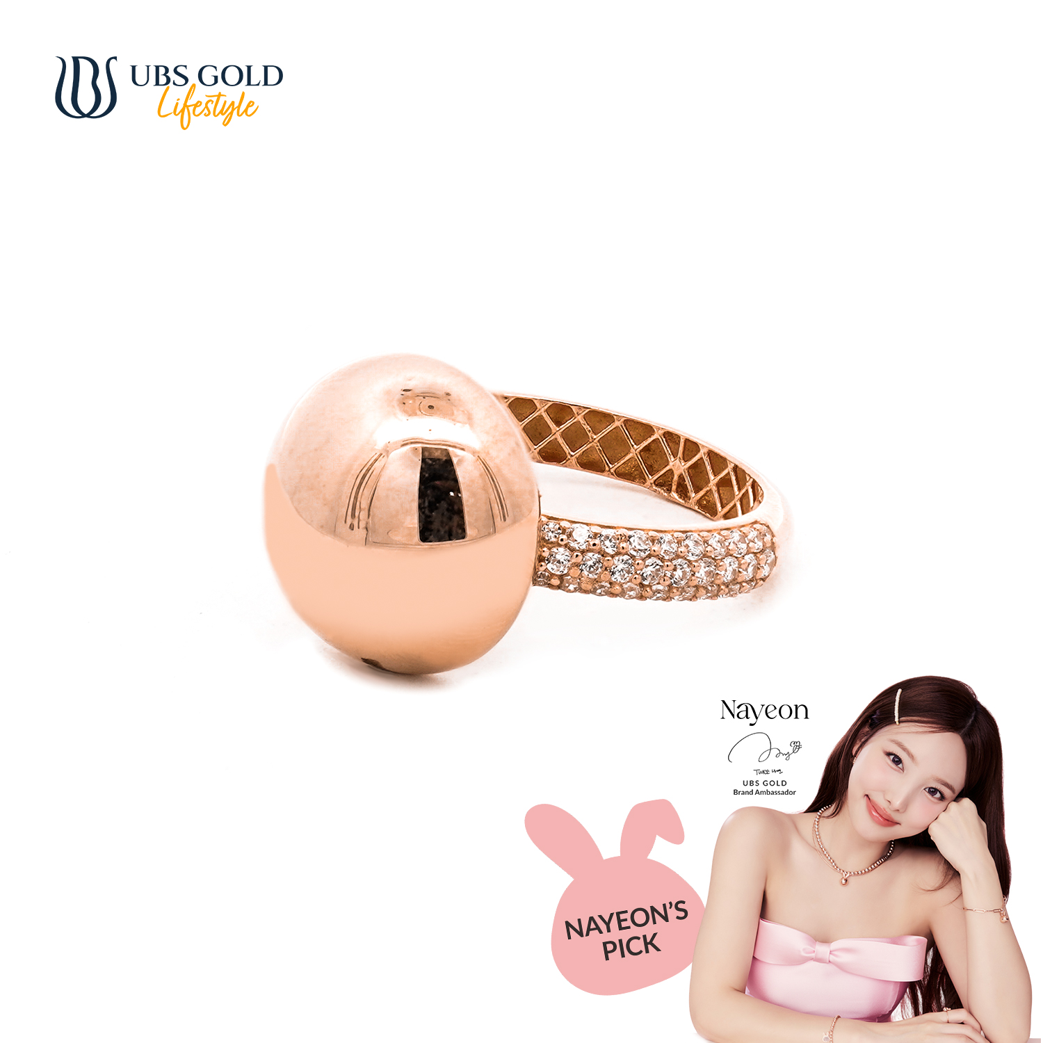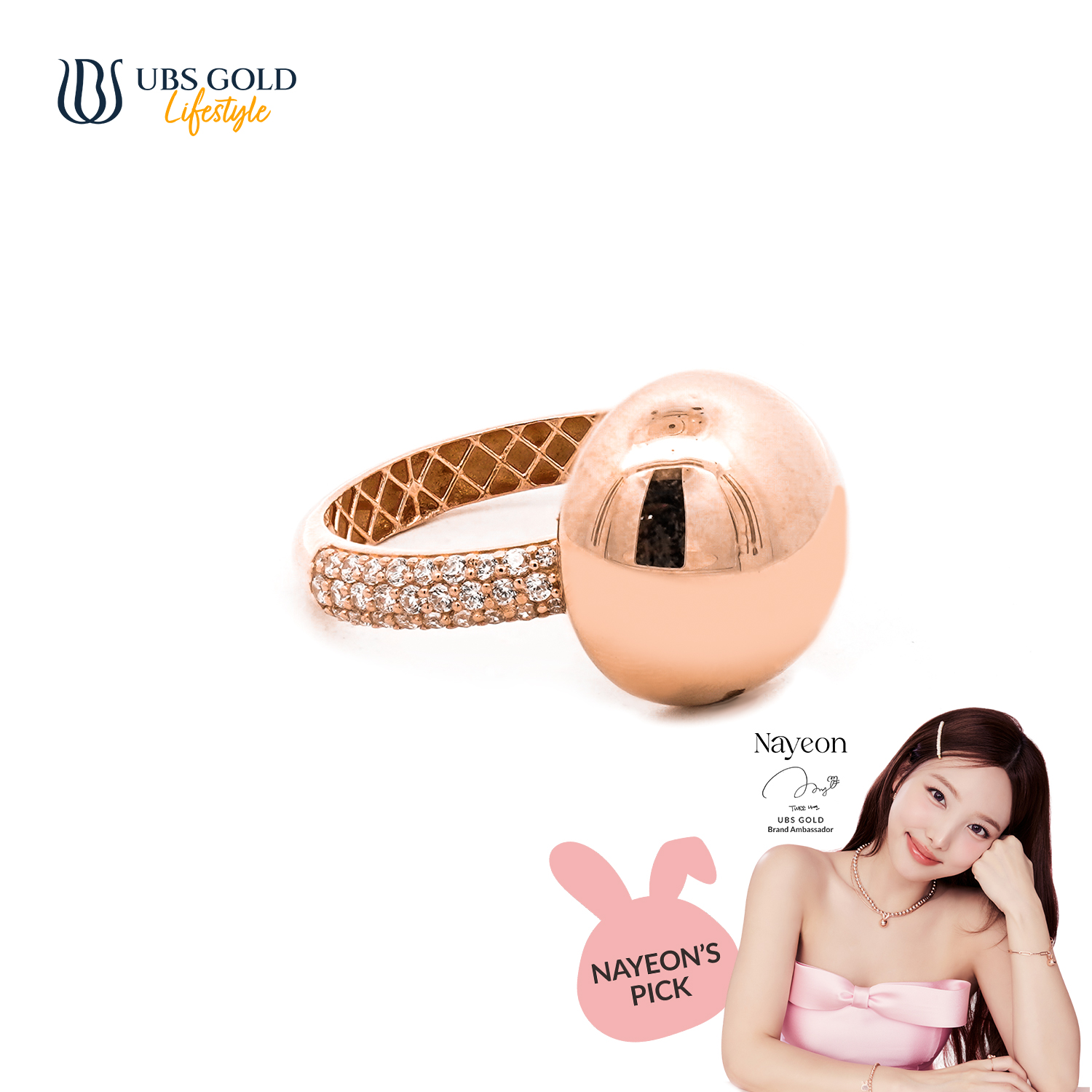 Dengan bangga, UBS Gold mempersembahkan perhiasan emas eksklusif kolaborasi dengan ikon K-Pop terkenal, Nayeon, yang dirancang untuk memberikan sentuhan elegan dan glamor pada penampilanmu.