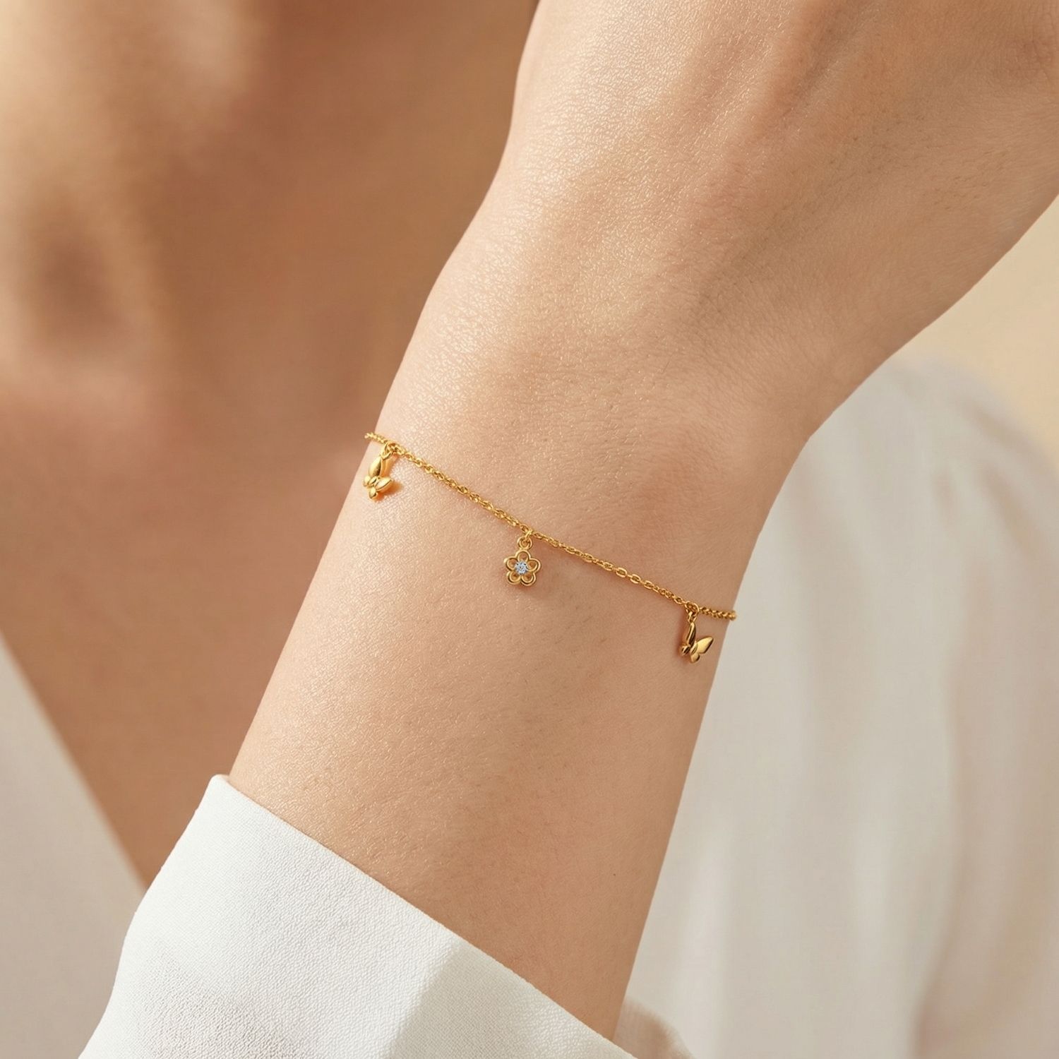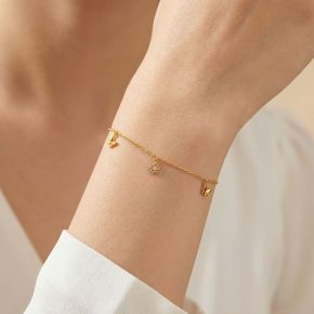 Lengkapi penampilan harian Anda dengan sentuhan manis dari koleksi gelang yang memadukan unsur alam ini. Informasi tambahan bentuk bunga dan kupu-kupu.