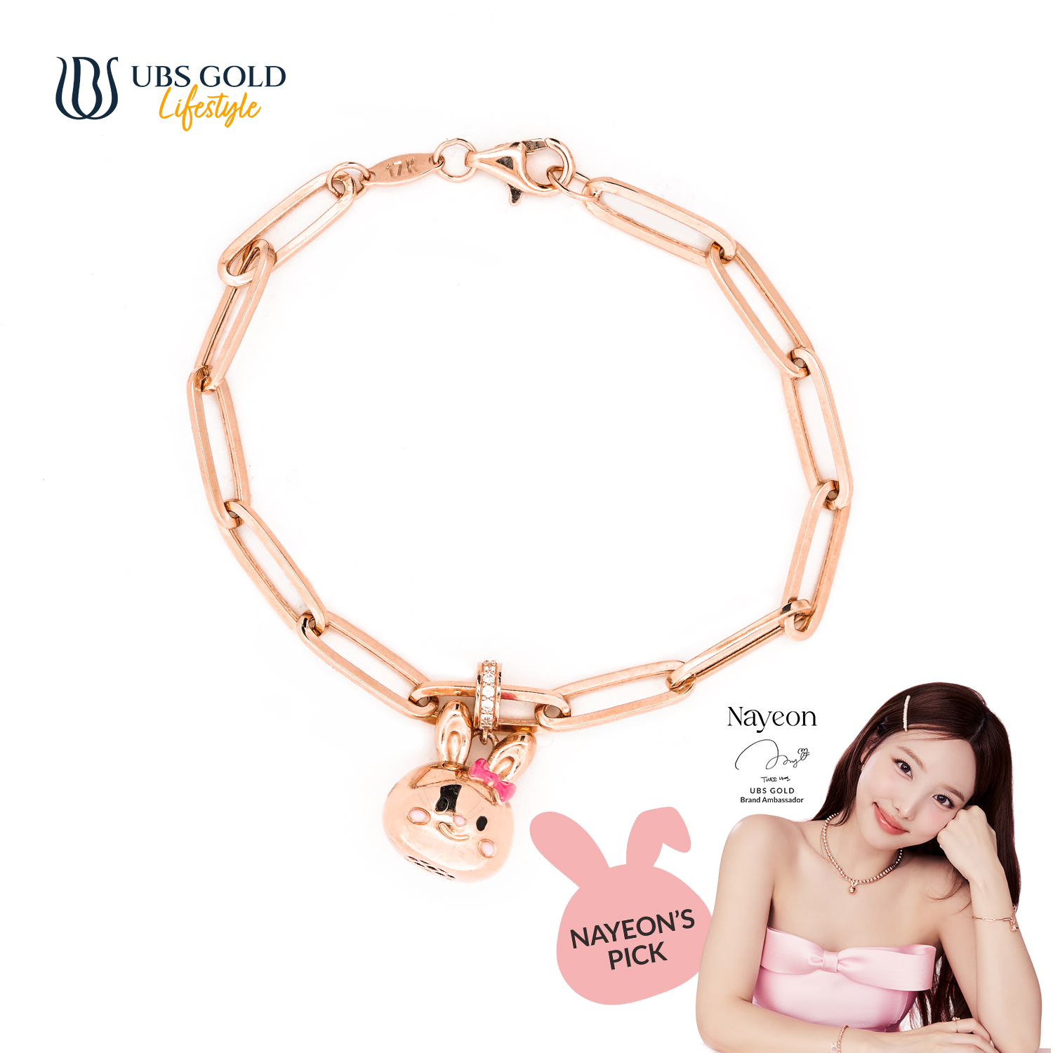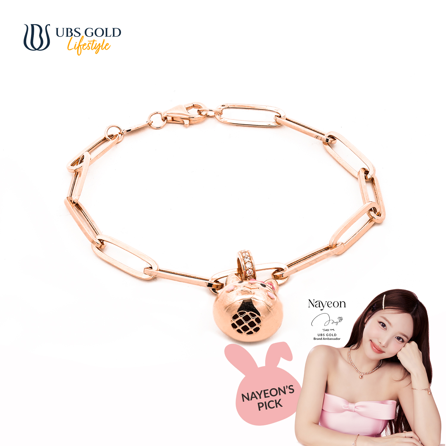 Dengan bangga, UBS Gold mempersembahkan perhiasan emas eksklusif kolaborasi dengan ikon K-Pop terkenal, Nayeon, yang dirancang untuk memberikan sentuhan elegan dan glamor pada penampilanmu.