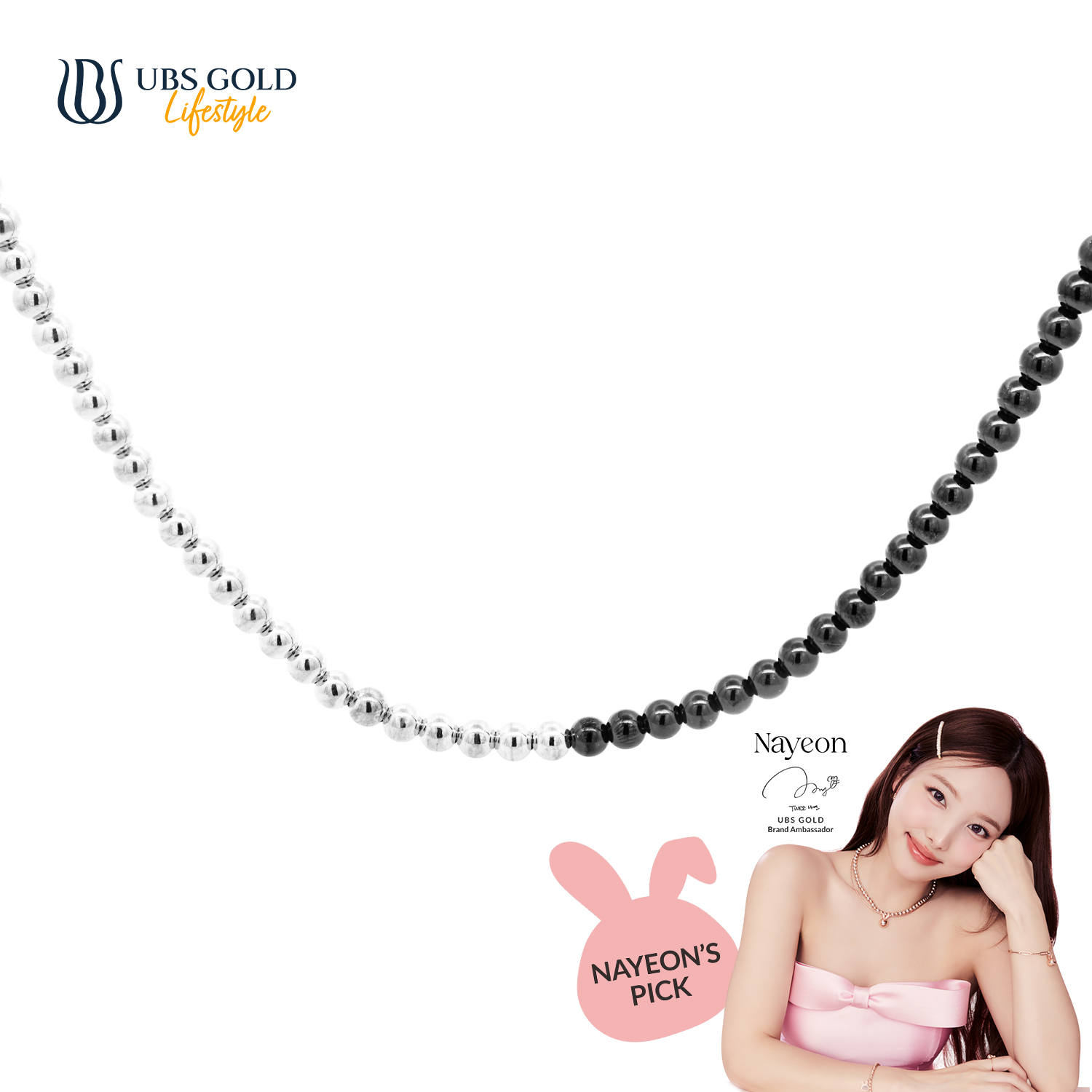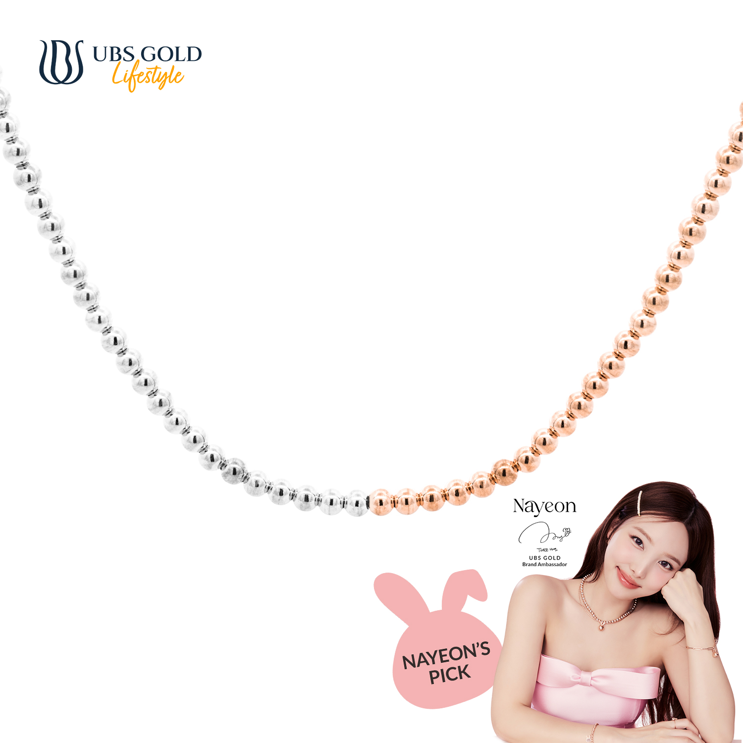 Dengan bangga, UBS Gold mempersembahkan perhiasan emas eksklusif kolaborasi dengan ikon K-Pop terkenal, Nayeon, yang dirancang untuk memberikan sentuhan elegan dan glamor pada penampilanmu.